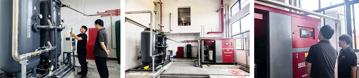 -Il compressore d'aria lubrificato dall'acqua senza olio di Geso utilizza acqua pura come lubrificante, fornendo aria compressa senza olio al 100% che soddisfa lo standard di classe 0 ISO 8573-1. Dotato di un sistema di filtrazione di precisione, rimuove efficacemente particelle maggiori di 0,01 μm, garantendo la sicurezza della produzione di strumenti di precisione.
